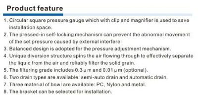 Product Feature: 1. Low pressure drop, high oil mist remove efficiency up to 99% and large drain bowl. 2. 0.3μm and 0.01μm filtering grade are available. 3. Two drain types are available: manual and semi-auto drain, and automatic drain. 4. To meet the needs of different environment the bowl material has Poly Carbonate, nylon and [...]